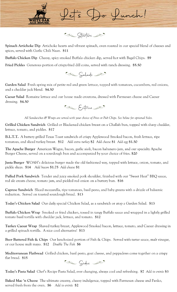 Welcome to White Oak Ale House, where a blend of vibrant flavors and a warm atmosphere awaits. Located at 1109 Boll Weevil Cir #9, Enterprise, AL, this culinary gem features a thoughtfully curated menu perfect for any dining occasion.
